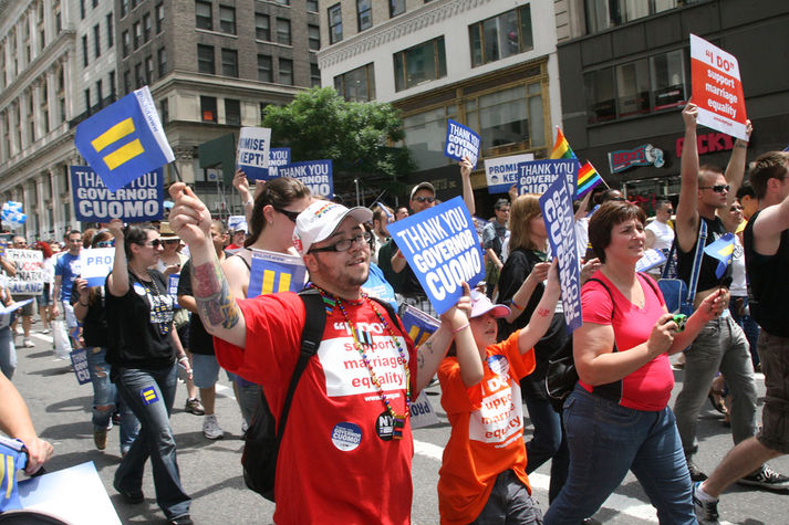 Gay Pride NYC 2011 Celebrating Marriage Equality signed into law by Governor Andrew Cuomo June 2011 Shown here on 5th Avenue NYC with Mayor Michael Bloomberg, City Council Speaker Christine Quinn, Cuomo's partner Sandra Lee, gay City Council Member Thomas Dwaine and fellow marchers families with children holding signs re love makes a family, respect all families. Also in march NYPD police chief Ray Kelly, with Gay Officers Action League, shots of the multi-racial crowds, gay men women and spectators, rainbow flags, float with The Royals, man with huge afro wig on bike, Lesbian Herstory Archives 36 years lavender banner with founders Deb Edel, coordinators Paula Grant, Saskia Scheffer, Teddy, Linda McKinney; Crowd shots sign "Lesbianism the positive alternative to Abortion" 5th Avenue filled with people and colorful flags and banners; Asian Woman in yellow with sticker saying "God made me Queer"